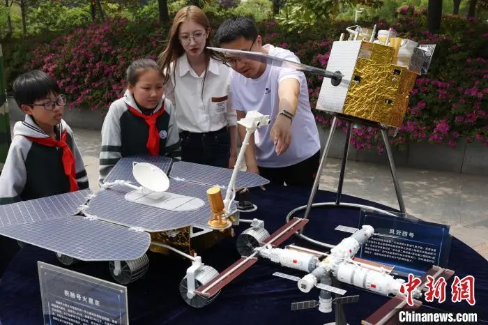 图为大学生给小学生讲解风云四号、祝融号火星车等模型。中新社记者 泱波 摄
