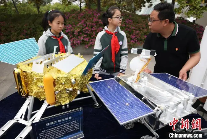 图为老师给小学生讲解嫦娥三号探测器、玉兔号月面巡视器模型。中新社记者 泱波 摄
