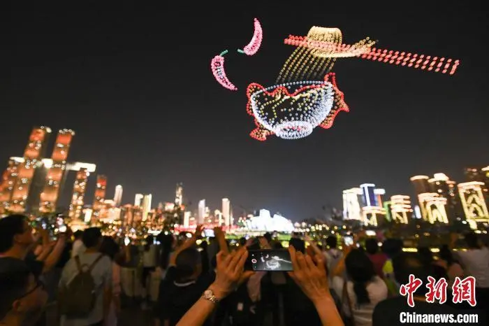 4月19日晚,“魅力重庆”无人机灯光秀在重庆两江四岸核心区进行首场正式展演。中新网记者 何蓬磊 摄