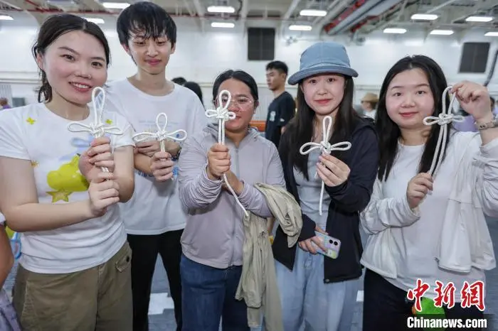 4月24日,海南澄迈马村港,在海南舰绳结展示区体验的民众展示自己打的万字结。中新社记者 骆云飞 摄