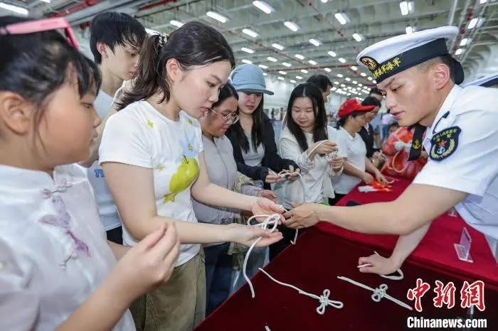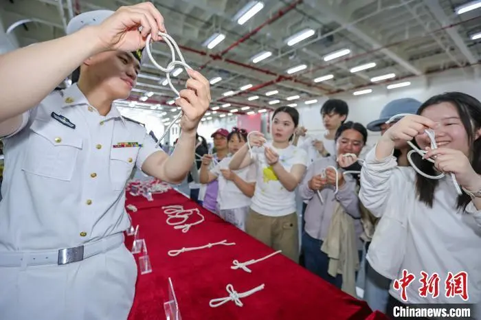 4月24日,海南澄迈马村港,海南舰内设置的绳结展示区吸引民众体验。中新社记者 骆云飞 摄