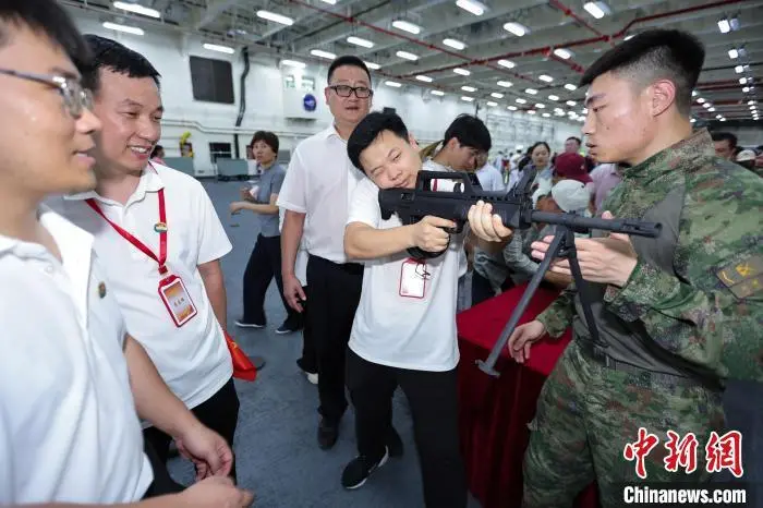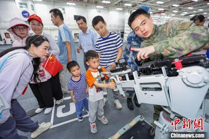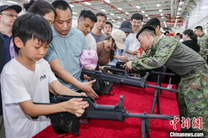 4月24日,海南澄迈马村港,海南舰内设置的武器展示区吸引民众体验。中新社记者 骆云飞 摄