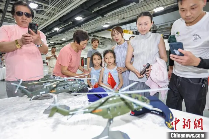 4月24日,海南澄迈马村港,海南舰内展出的直升机模型吸引民众参观。中新社记者 骆云飞 摄