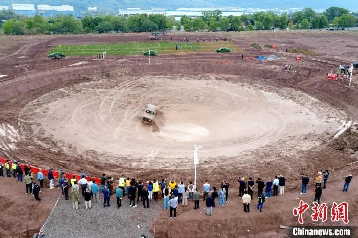 冲破泥浪、盘旋转圈、漂移、冲坡……4月27日,在位于重庆市沙坪坝区的V5 PARK西部汽摩公园,一辆辆越野车在直径近百米的土坑中盘旋疾驰,进行越野涮锅挑战,引得围观人群尖叫不断。越野涮锅是一种挑战活动,指车辆在泥坑或沙坑中沿边缘绕圈行驶,以测试车辆性能和驾驶技术。V5 PARK西部汽摩公园里的巨型土坑形似一口大锅,被命名为“重庆麻辣锅”,每天吸引众多越野车爱好者前来挑战。图为越野涮锅挑战。肖江川 摄