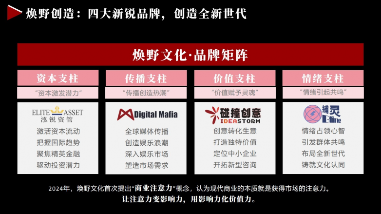 2024年,焕野文化首次提出“商业注意力”概念,认为现代商业的痛点就是获得市场的注意力。让注意力变影响力,用影响力化价值力。