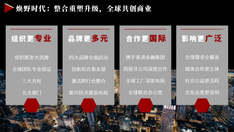 在本次发布会上,焕野文化全面介绍了其在组织架构、品牌矩阵、国际合作及市场影响力等方面的全新升级。公司围绕“组织更专业、品牌更多元、合作更国际、影响更广泛”四大方向进行了战略布局,彰显其在全球市场中的创新活力与前瞻性视野。