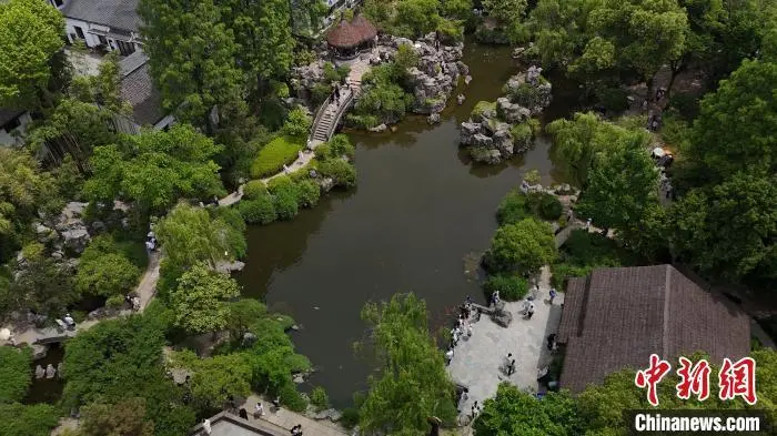 5月3日,航拍“孤鹤轩”亭前游人如织。今年“五一”假期,位于浙江绍兴的沈园吸引游客打卡。沈园是南宋时期沈姓富商的私家花园,公元1151年春天,诗人陆游与结发妻子唐琬重逢于此,留下千古绝唱《钗头凤》。(无人机照片)中新社记者 项菁 摄
