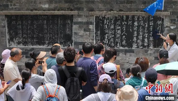 5月3日,航拍游客参观照壁上的《钗头凤》原词。今年“五一”假期,位于浙江绍兴的沈园吸引游客打卡。沈园是南宋时期沈姓富商的私家花园,公元1151年春天,诗人陆游与结发妻子唐琬重逢于此,留下千古绝唱《钗头凤》。(无人机照片)中新社记者 项菁 摄