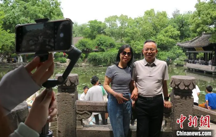 5月3日,一对夫妻在沈园合影。今年“五一”假期,位于浙江绍兴的沈园吸引游客打卡。沈园是南宋时期沈姓富商的私家花园,公元1151年春天,诗人陆游与结发妻子唐琬重逢于此,留下千古绝唱《钗头凤》。中新社记者 项菁 摄