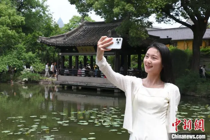 5月3日,一名游客在沈园自拍留影。今年“五一”假期,位于浙江绍兴的沈园吸引游客打卡。沈园是南宋时期沈姓富商的私家花园,公元1151年春天,诗人陆游与结发妻子唐琬重逢于此,留下千古绝唱《钗头凤》。中新社记者 项菁 摄