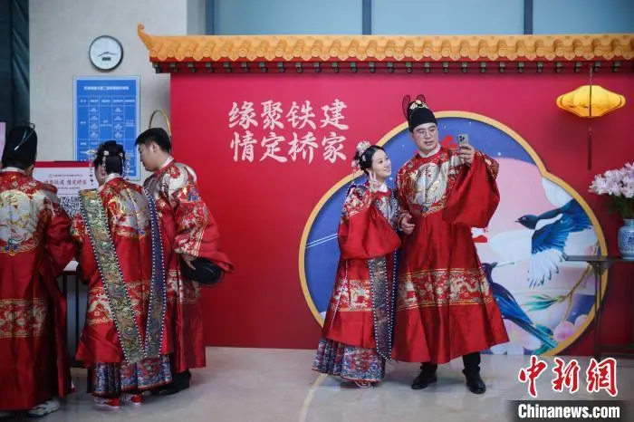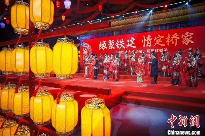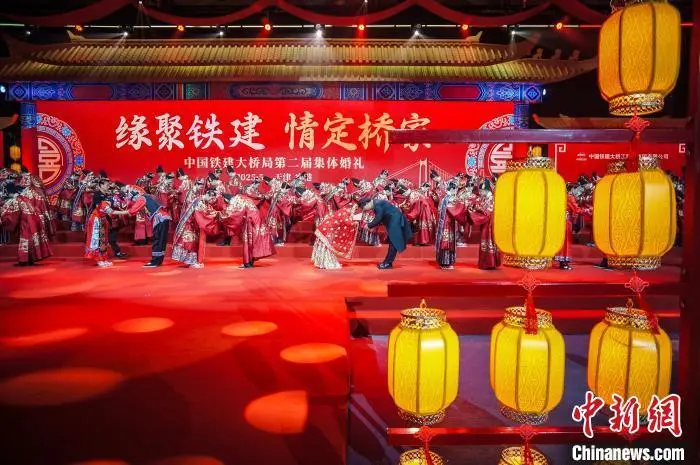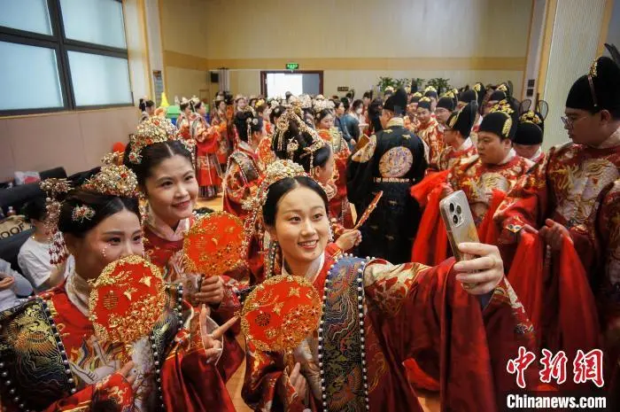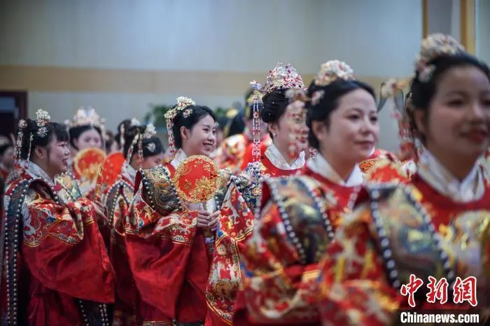 5月21日,天津,参加集体婚礼的新娘在仪式前合影。当日,中铁建大桥局在天津为来自建设一线的职工举办以“缘聚铁建,情定桥家”为主题的中式集体婚礼,46对新人身着传统中式礼服,在嘉宾亲友的见证下完成拜天地、结发礼、合卺礼等环节,走进婚姻殿堂。中新社记者 佟郁 摄