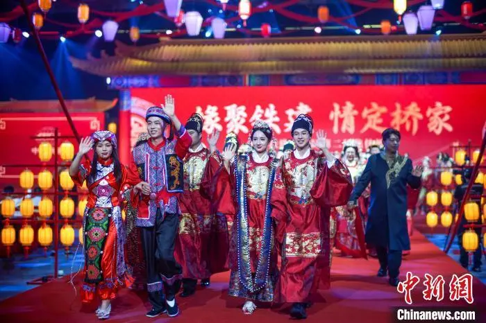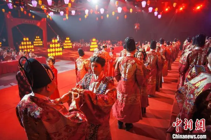 5月21日,天津,新人在集体婚礼上进行合卺礼环节。中新社记者 佟郁 摄