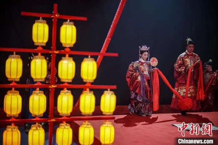 5月21日,天津,一对新人在集体婚礼上进行结发礼环节。中新社记者 佟郁 摄