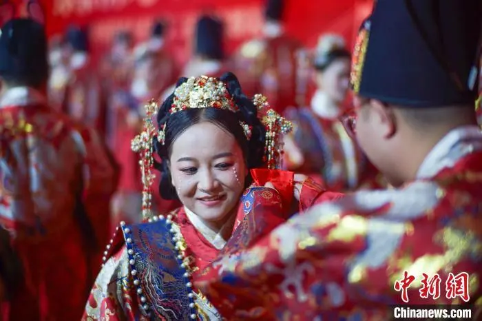 5月21日,天津,新人在集体婚礼上进行夫妻对拜环节。中新社记者 佟郁 摄