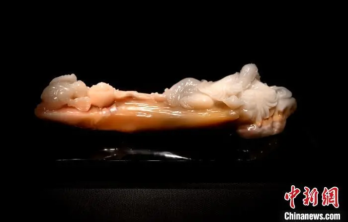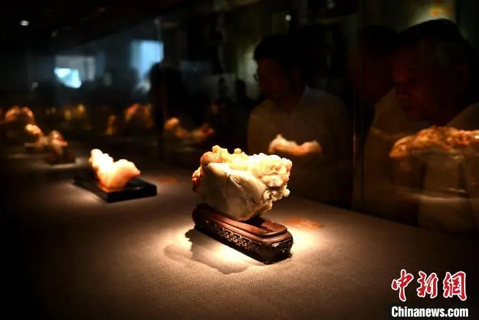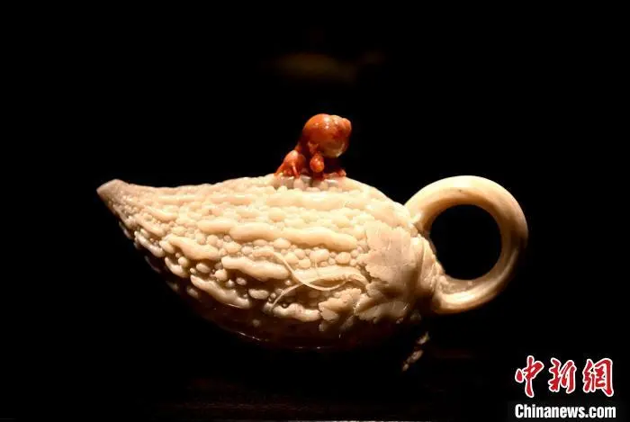 5月29日,石韵茶香——石雕艺术与茶文化联展在福州东方石艺城开幕。本次展览汇聚了30余位工艺美术大师的匠心之作,展现了包括寿山石、昌化石、青田石、巴林石等石雕艺术品。同时,百年生长的古树普洱、武夷山大红袍、福鼎白毫银针等名茶一并展出。展览由福建省寿山石文化艺术研究会、福州雕刻工艺品总厂、福州市寿山石行业协会等单位主办,文化生活报社等单位承办。图为陈明志的作品《夏意壶》。中新社记者 吕明 摄