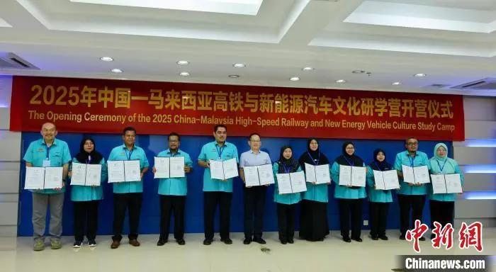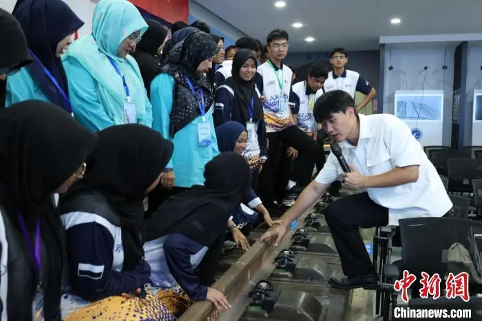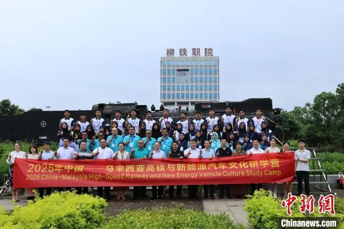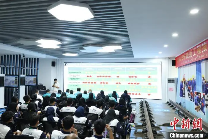6月11日,中国—马来西亚高铁与新能源汽车文化研学营开营仪式在柳州铁道职业技术学院举行。马来西亚彭亨州代表团一行49人在广西柳州市开展为期5天的研学活动,双方还就职业教育交流、教师专业发展、文化交融等方面达成合作意向。图为马来西亚学子了解中国铁路技术。中新社记者 林馨 摄