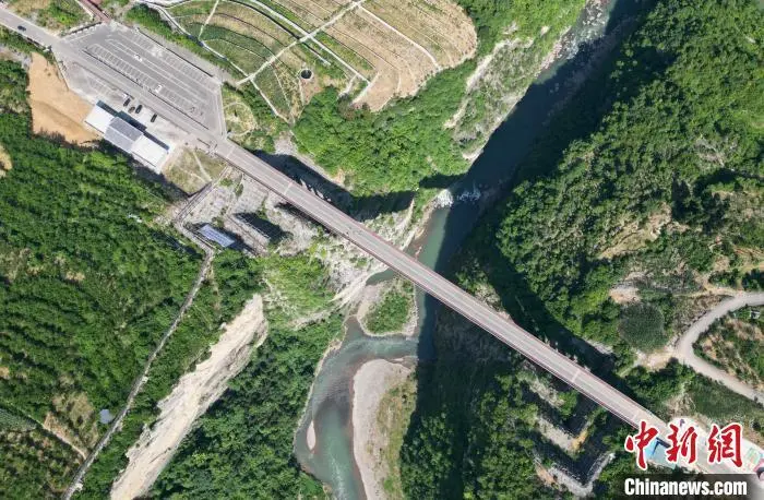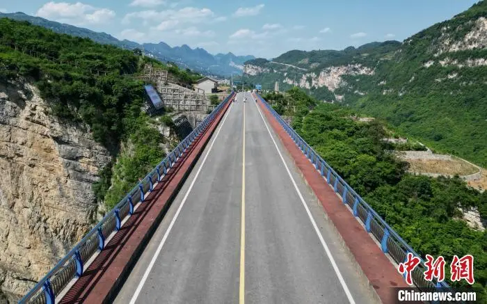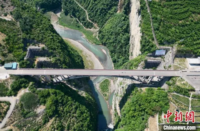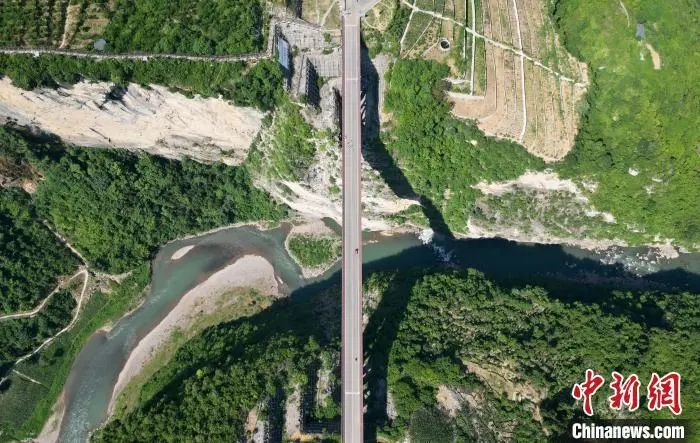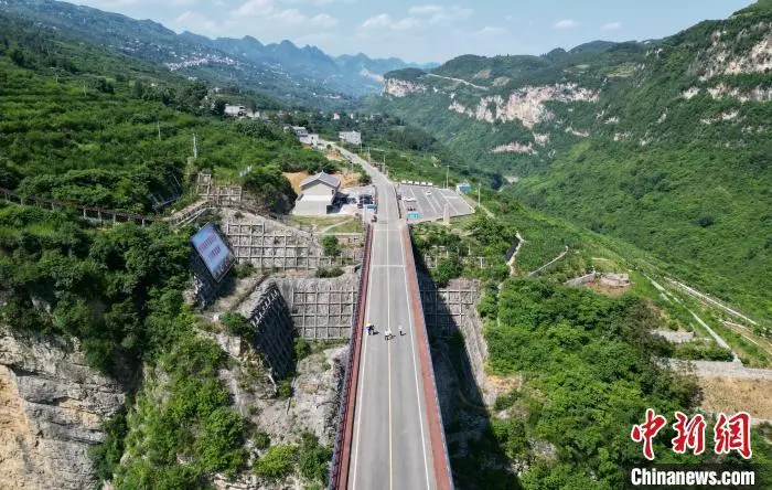 6月13日,航拍鸡鸣三省大桥。位于四川省泸州市叙永县的大峡谷,赤水河和渭河劈崖而过,四川、云南、贵州分居悬崖三侧,出现“一鸡鸣唱,三省齐聆”的地理奇观。鸡鸣三省大桥全长286.4米,桥梁宽度为11.5米。2020年建成通车至今,彻底改变了当地汉族、彝族、苗族等群众的出行方式,成为名副其实的“连心桥”“致富桥”, 直接受益人口达40余万人。中新社记者 王磊 摄