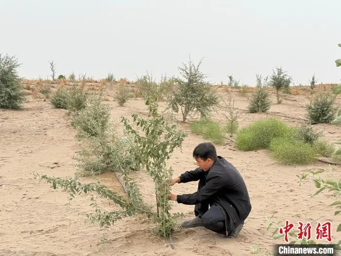 6月16日,新疆喀什地区温阿勒台库什村干部木合塔尔·艾买尔在固定沙枣树苗。 中新社记者 刘子衿 摄