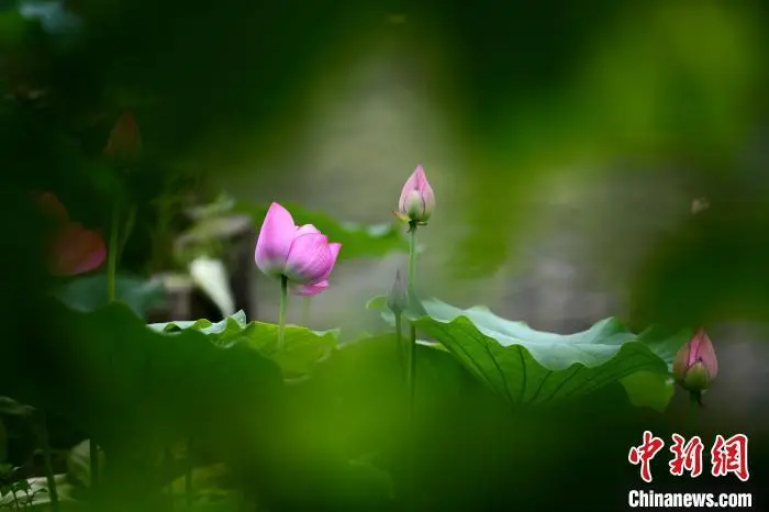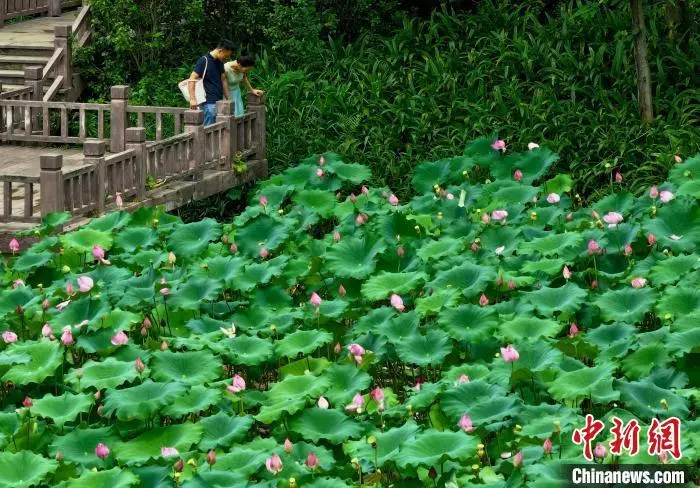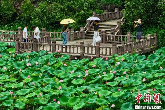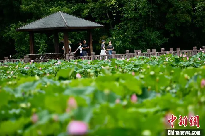 6月17日,福建福州,游客在金山公园赏荷花。近日,福州金山公园的荷花进入盛花期,碧叶连天、粉荷摇曳的景致吸引了众多市民和摄影爱好者前来观赏。中新社记者 王东明 摄