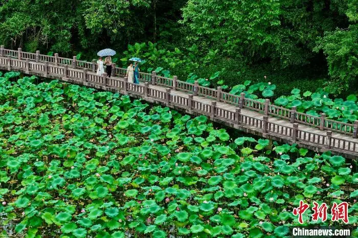 6月17日,福建福州,游客在金山公园赏荷花。(无人机照片)中新社记者 王东明 摄