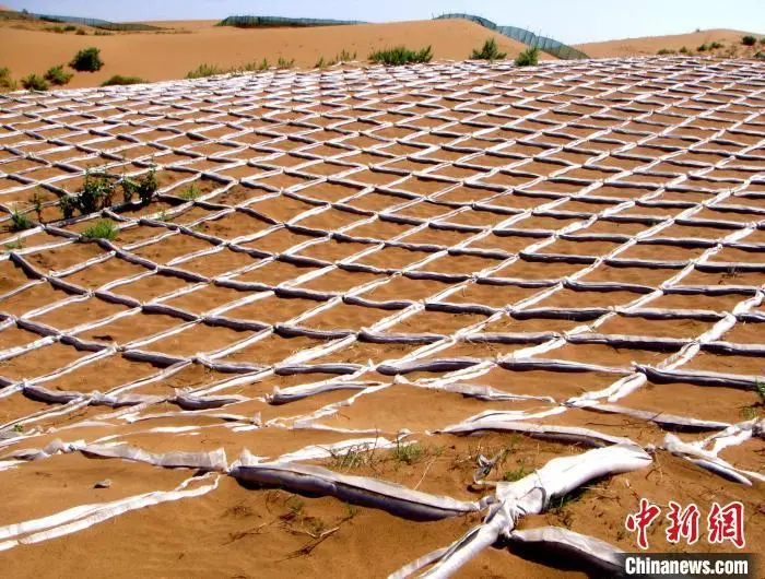 民勤县运用“固身削顶”治沙技术,在沙丘迎风坡三分之二以下区域布设土工编织袋沙障。(资料图)马爱彬 摄