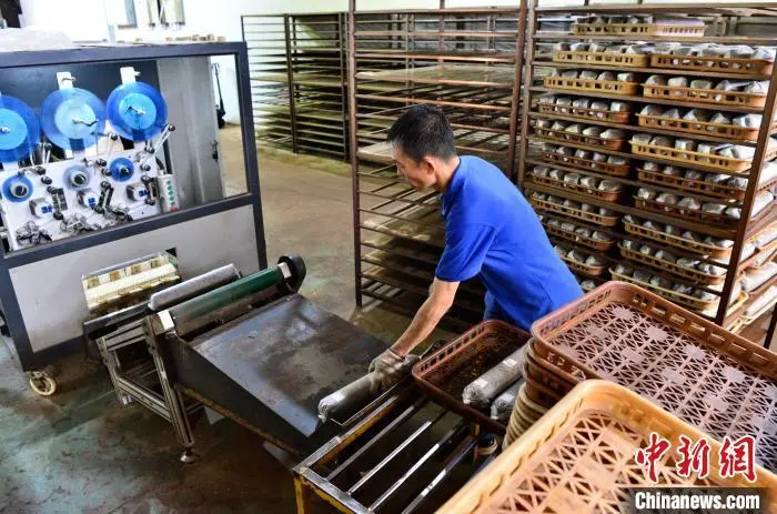 6月26日,在古田县一家食用菌生产企业的无公害银耳基地内,工人在菌棒生产线上作业。中新社记者 张斌 摄