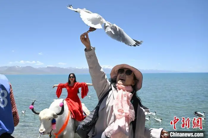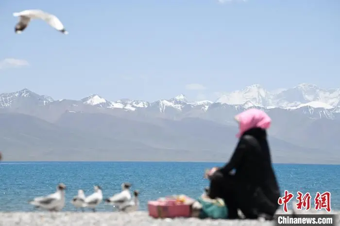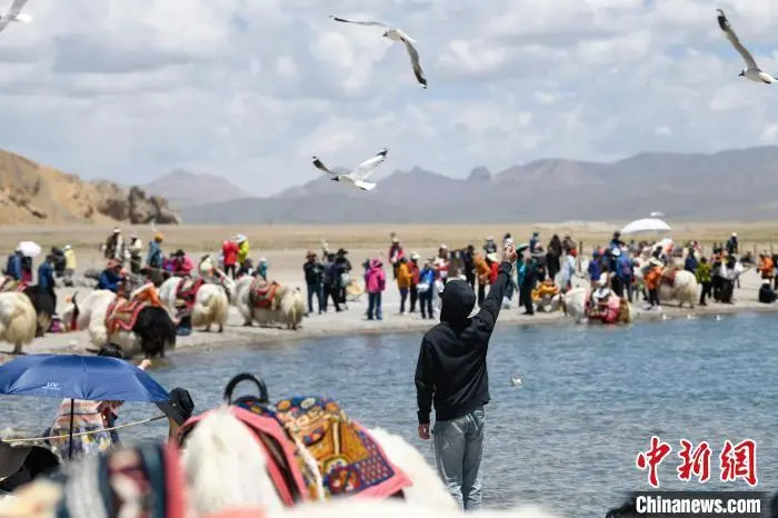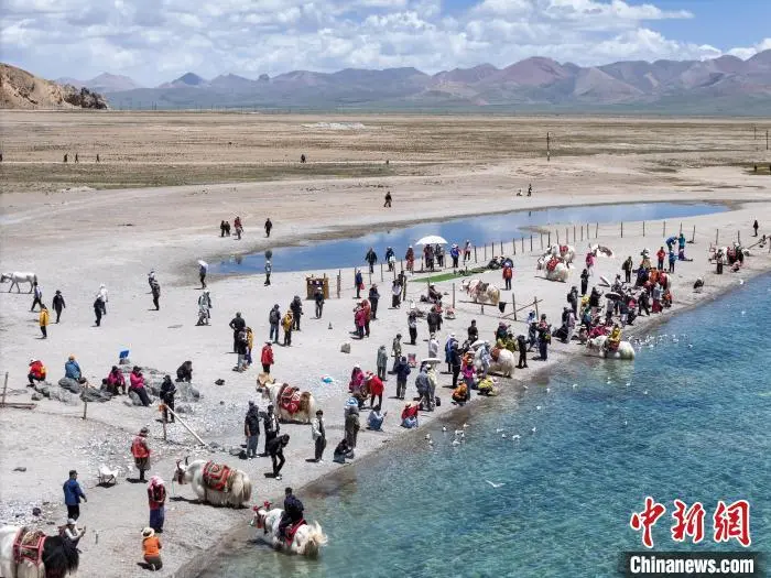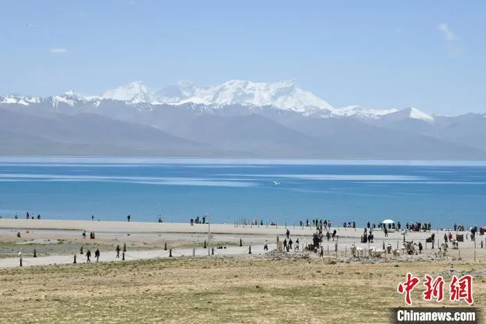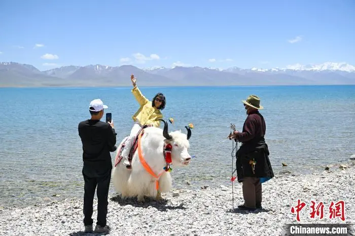 6月26日,随着气温逐渐升高,西藏纳木错迎来旅游旺季。纳木错,藏语意为“天湖”,位于西藏自治区中部,拉萨市当雄县和那曲市班戈县之间,面积超2000平方公里,湖面海拔4718米,是世界海拔最高的大型咸水湖。图为游客在纳木错湖边拍照留念。中新社记者 贡嘎来松 摄