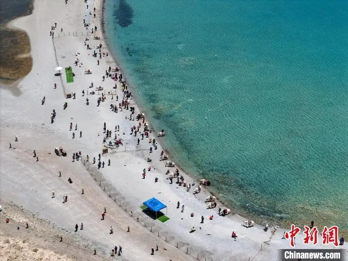 图为游客在纳木错湖边游玩。(无人机照片)中新社记者 贡嘎来松 摄