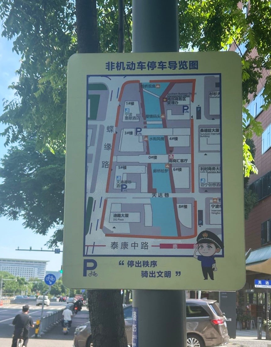 治理有力还需疏导有法。在开展集中整治的同时,南部商务区中队秉持“服务为先”理念,一方面精心选择13处醒目点位设置动漫普法宣传版、非机动车停放导览图,引导市民文明出行、规范停车;另一方面,逐一走访楼宇物业,指导其结合实际需求,合理划设外卖车辆专属停车区域,既充分满足车辆停放需求,又有效规范停车秩序,目前已指导设置外卖车辆专属停车位6处。