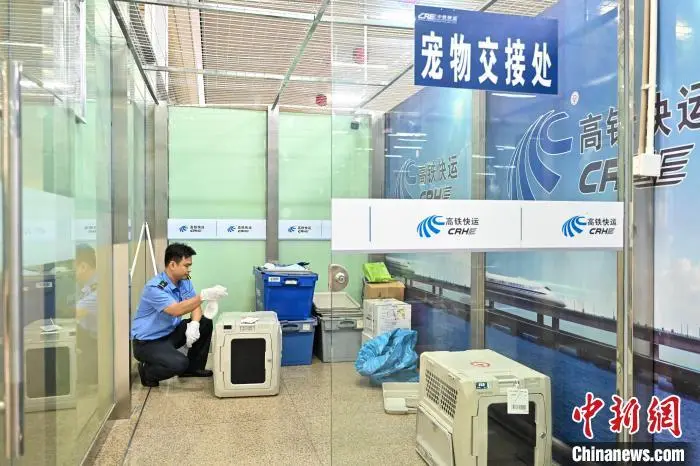 7月3日,广州南站中铁快运营业部工作人员整备高铁宠物运输箱。中新社记者 陈骥旻 摄