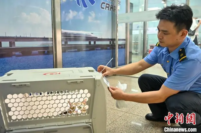 7月3日,广州南站中铁快运营业部工作人员在高铁宠物运输箱上粘贴宠物猫的“车票”。目前,广铁集团在广州南站开设的宠物托运试点车次为G335、G1580、G879、G884、G1302/3、G6120、G6003次7趟动车组列车,可运送的目的地有北京、上海、深圳、长沙、武汉、郑州、石家庄、南昌、杭州9个车站。中新社记者 陈骥旻 摄