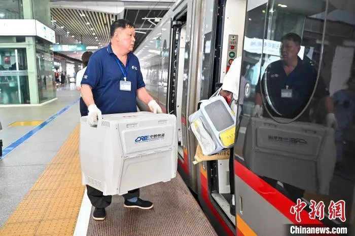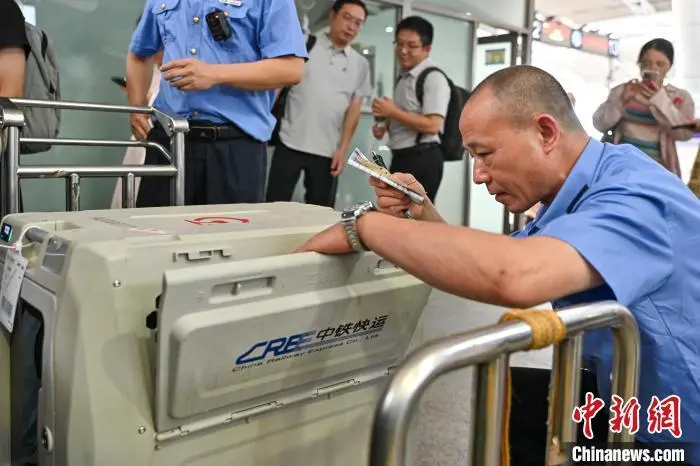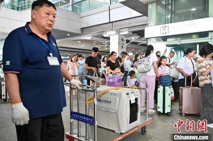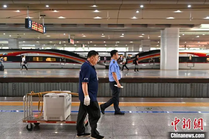7月3日,广州南站中铁快运营业部工作人员运送装有宠物猫的运输箱前往车厢。中新社记者 陈骥旻 摄