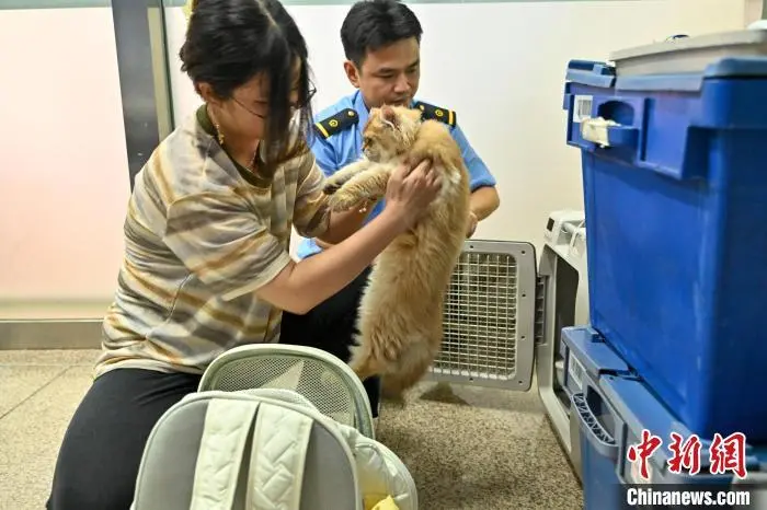 7月3日,旅客在广州南站中铁快运营业部领取宠物猫。中新社记者 陈骥旻 摄