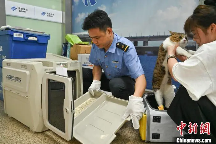 7月3日,广州南站中铁快运营业部工作人员为宠物猫整备高铁宠物运输箱。中新社记者 陈骥旻 摄