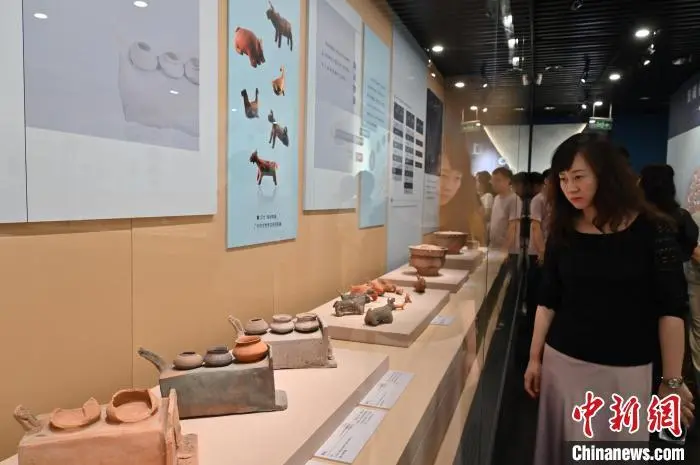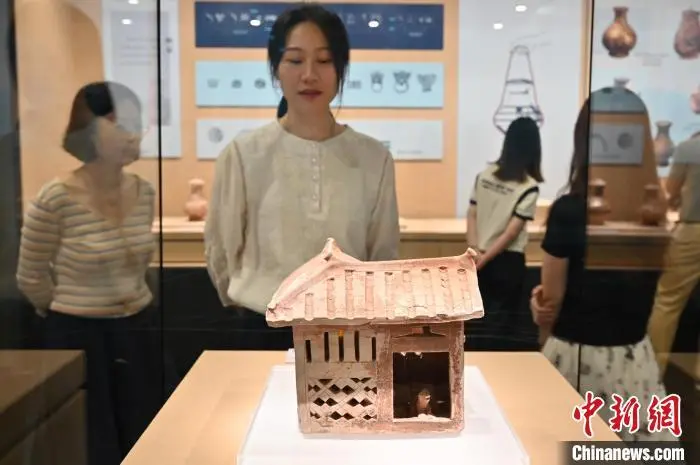 7月10日,由南越王博物院(西汉南越国史研究中心)主办的“甄·集——南越王博物院藏品征集成果展”在广州市南越王博物院王宫展区开幕。本次展览精选了300余件(套)通过接收移交、接受捐赠、购买等方式征集的文物。图为东汉时期的曲尺式陶屋吸引参观者。中新社记者 陈楚红 摄