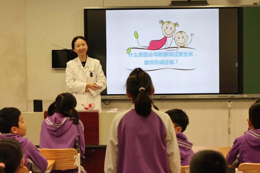 北京大学第三医院眼科主任医师张钰在清华附小,为小学生们科普近视防控知识。(受访者供图)