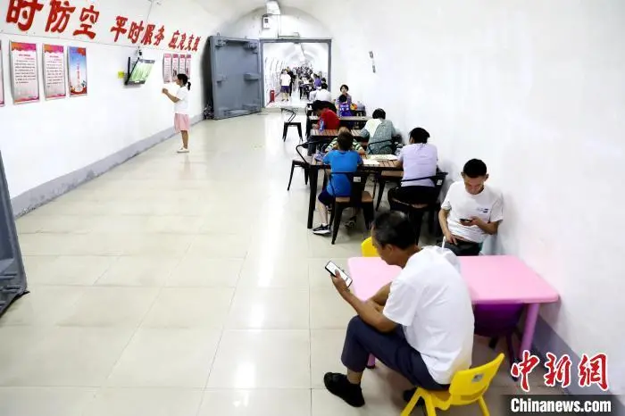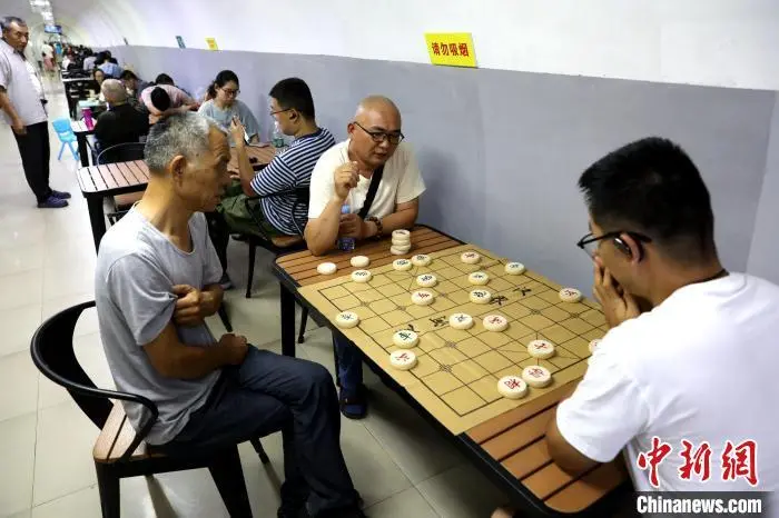 7月15日,陕西西安,市民在防空洞内对弈。当日,西安市气象台继续发布高温红色预警信号,西安市区及周边多个区县最高气温将升至40至42℃,局地可达42℃以上。中新社记者 张远 摄