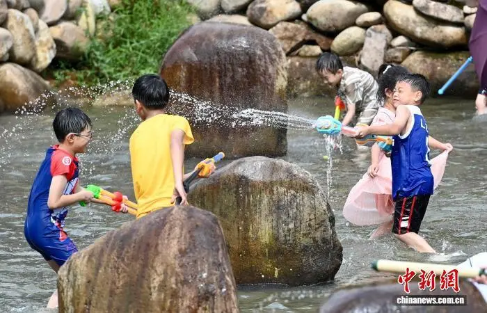 图为7月18日,小朋友在周宁县泗桥乡溪口村玩水消暑。中新社记者 王东明 摄
