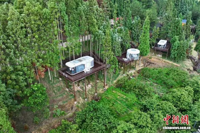 图为7月18日,周宁县泗桥乡溪口村搭建在小山坡上的特色民宿。(无人机照片)中新社记者 王东明 摄