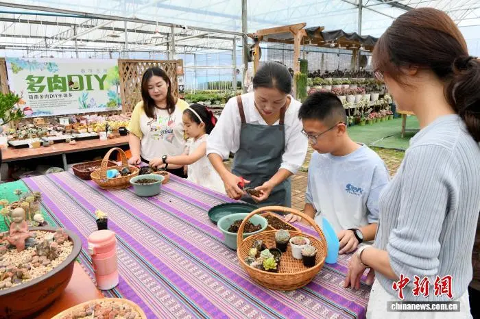 图为7月19日,小朋友在周宁多肉种植园大棚内体验制作多肉盆景。中新社记者 王东明 摄
