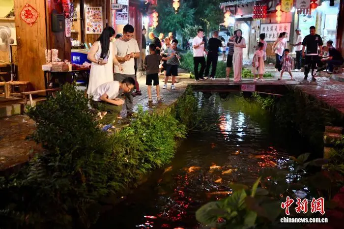 图为7月17日晚,游客在周宁县浦源镇鲤鱼溪景区参观游览。中新社记者 王东明 摄