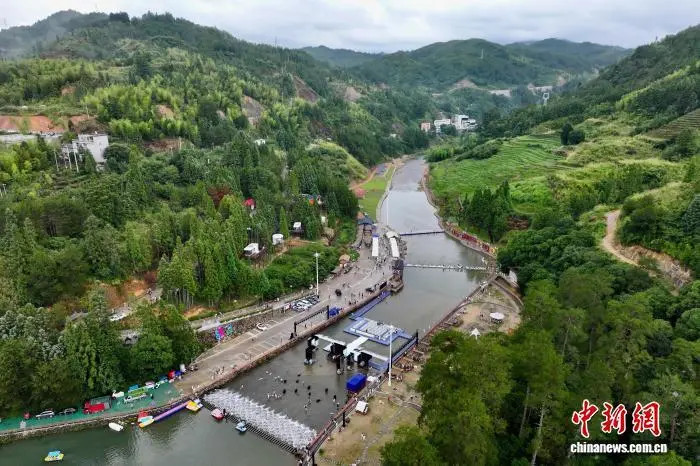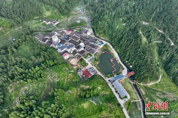 走进福建省宁德市周宁县,山峦叠翠,溪水潺潺。周宁县平均海拔 800多米,森林覆盖率高达 72.96%,夏季日平均气温仅 24 摄氏度,空气质量常年达到国家一级标准,冬少严寒,夏无酷暑,被誉为 “天然空调城”。近年来,周宁县依托自身优越的生态资源,聚焦康养旅游产业发展,加大投入完善设施,全链条优化服务,积极培育“康养+”新业态,推动文旅、农业、康养等多元业态深度融合。图为7月18日,山水环绕的周宁县泗桥乡溪口村吸引众多游客前来游玩避暑。(无人机照片)中新社记者 王东明 摄
