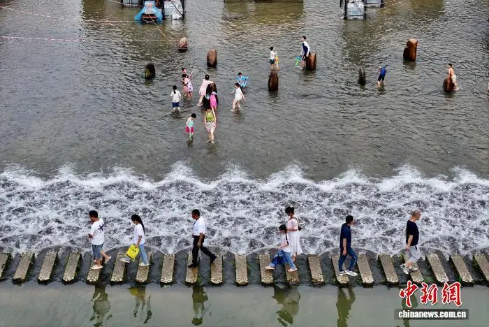图为7月18日,游客在周宁县泗桥乡溪口村玩水消暑。(无人机照片)中新社记者 王东明 摄