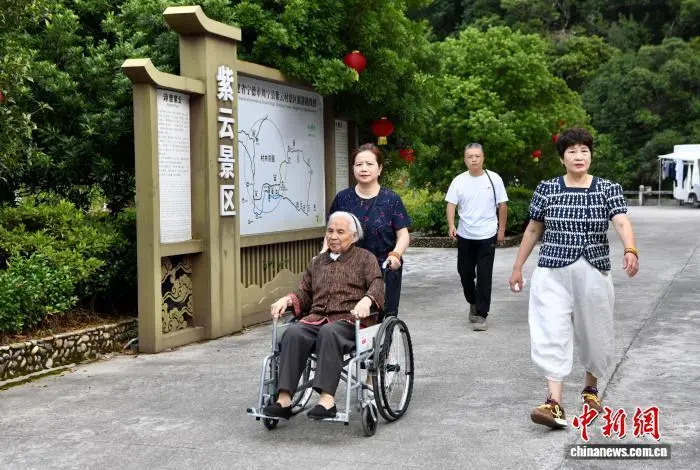 图为7月17日,前来周宁县浦源镇紫云村避暑的“银发族”在村里散步。中新社记者 王东明 摄