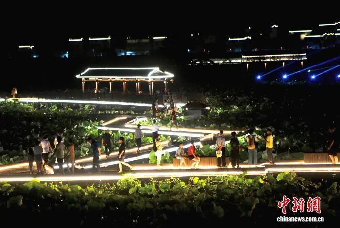 图为7月17日晚,游客在周宁县浦源镇荷花池游逛。中新社记者 王东明 摄