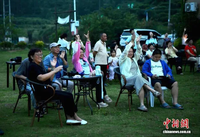 图为7月17日晚,前来周宁县浦源镇紫云村避暑的游客在村里观看演出。中新社记者 王东明 摄