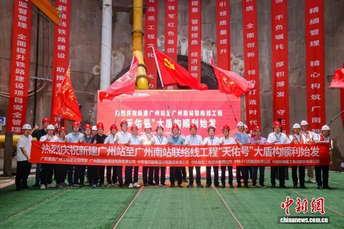 中新网广州7月24日电 (郭军 李露 陈霞 董剑锋)新建广州站至广州南站联络线工程(简称“广南联络线”)迎来关键节点——设计开挖直径达12.86米的“天佑号”大型盾构机23日在广州正式始发,标志着该工程配备的三台盾构机已全部投入作业,项目建设正式进入全线地下隧道攻坚阶段。