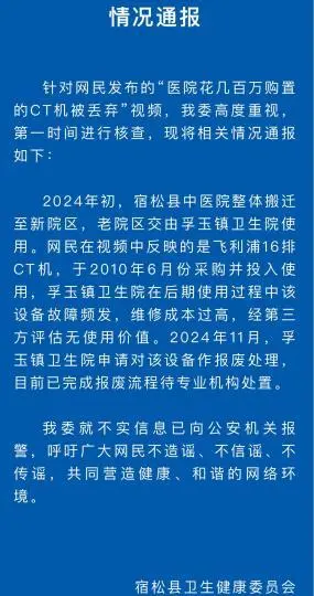 2024年初,宿松县中医院整体搬迁至新院区,老院区交由孚玉镇卫生院使用。网民在视频中反映的是飞利浦16排CT机,于2010年6月份采购并投入使用,孚玉镇卫生院在后期使用过程中该设备故障频发,维修成本过高,经第三方评估无使用价值。2024年11月,孚玉镇卫生院申请对该设备作报废处理,目前已完成报废流程待专业机构处置。(完)