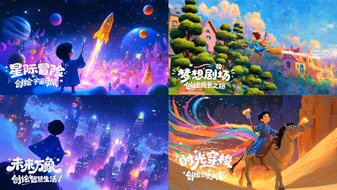 “星际冒险,创绘宇宙奇旅”鼓励孩子们大胆描绘宇宙生态、太空城市等,激发对未知世界的探索精神;“梦想剧场,创绘成长之路”倡导发现自我、认知自我,表达成长感悟与期许,让作品成为写给未来自己的温暖信笺;“未来万象,创绘智慧生活”聚焦以“问题解决者”视角构想未来生活场景,思考如何让技术更有温度,用创造力回答“怎样的未来值得期待”;“时光穿梭,创绘历史新影”强调突破“古老”与“新潮”的界限,重新诠释历史符号,激发文化自信与创新表达。