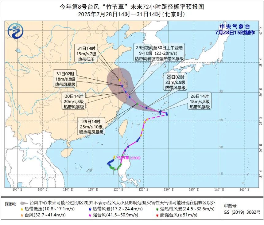 今年第8号台风“竹节草”(热带风暴)28日14时中心位于东经128.2度,北纬26.6度,即在宁波东南偏东方向746公里处,中心气压992百帕,最大风力18米/秒(8级) ,七级风圈半径200—300公里。预计“竹节草”将以每小时20-25公里的速度向西偏北方向移动,强度缓慢增强。